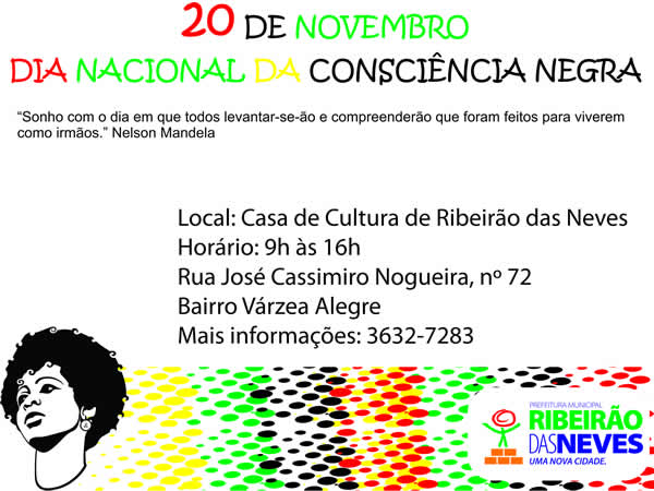 A Prefeitura Municipal de Ribeirão das Neves, através da Secretaria Municipal de Cultura, prepara uma programação especial para comemorar o "Dia da Consciência Negra", nesta quarta-feira, dia 20 de Novembro. Entre as atividades que irão compor a programação estão apresentações de dança, capoeira, teatro e oficinas. Todas as atividades serão realizadas na Casa de Cultura Vitória Moreira Neves, na rua José Cassimiro Nogueira, 72, bairro Várzea Alegre.