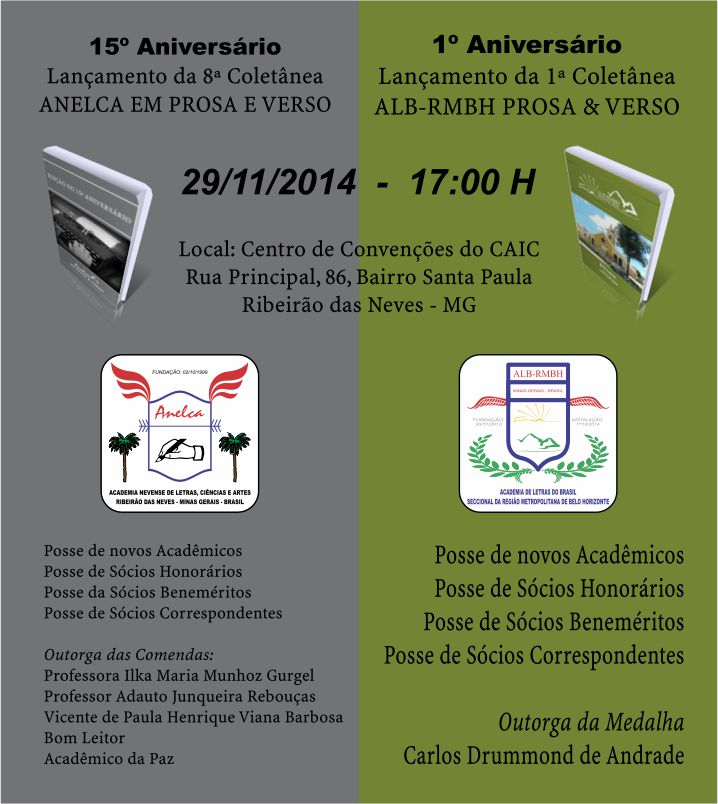A Academia Nevense de Letras, Ciências e Artes (Anelca) comemora, neste sábado (29), a partir das 17h, no Centro de Convenções do CAIC, o 15º aniversário da instituição. Durante o evento, acontece o lançamento da 8ª Coletânea Anelca em Prosa e Verso e da 1ª Coletânea da Academia de Letras do Brasil na Região Metropolitana de Belo Horizonte.