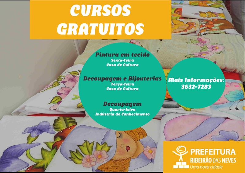 A Secretaria Municipal de Cultura divulgou, nesta semana, a abertura de vagas para os cursos gratuitos de Pintura em Tecido, Decoupagem e Bijouterias em diferentes espaços.