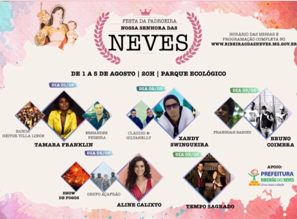 18h30 - Procissão com a imagem de Nossa Senhora das Neves saindo da capela São Vicente de Paulo até a Matriz, com participação da Banda de Música.