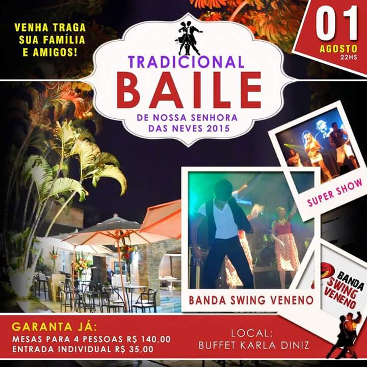 A Comissão de Festeiros da Paróquia Nossa Senhora das Neves divulgou, nessa semana, os detalhes do Tradicional Baile de Nossa Senhora das Neves 2015, que será realizado no sábado, 1º de agosto, às 22h, no Buffet Karla Diniz, ao lado do Parque Ecológico de Ribeirão das Neves.