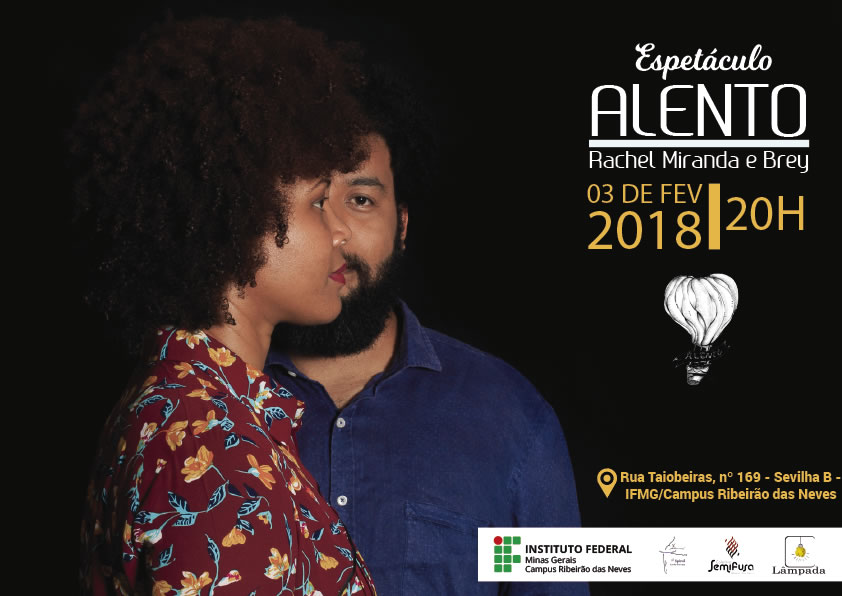 Alento significa fôlego, respiro, vigor, entusiasmo. O espetáculo é um convite ao desvio do ritmo acelerado da rotina que a vida contemporânea impõe, em especial, a vida urbana, é um convite ao desaceleramento. Nesse contexto, o espetáculo Alento estreia no dia 3 de fevereiro, às 20h, no auditório do IFMG, em Ribeirão das Neves, com Marcos Brey e Rachel Miranda.