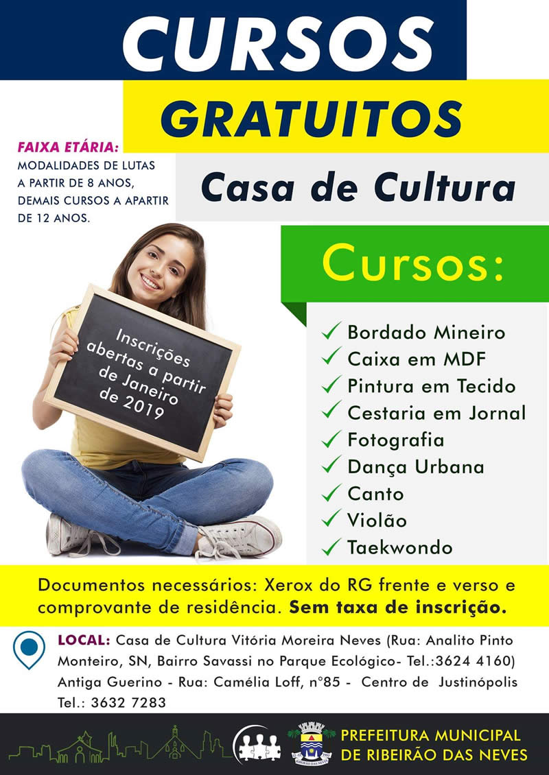 A Secretaria Municipal de Esportes e Cultura de Ribeirão das Neves está com inscrições abertas para cursos gratuitos na Casa de Cultura.