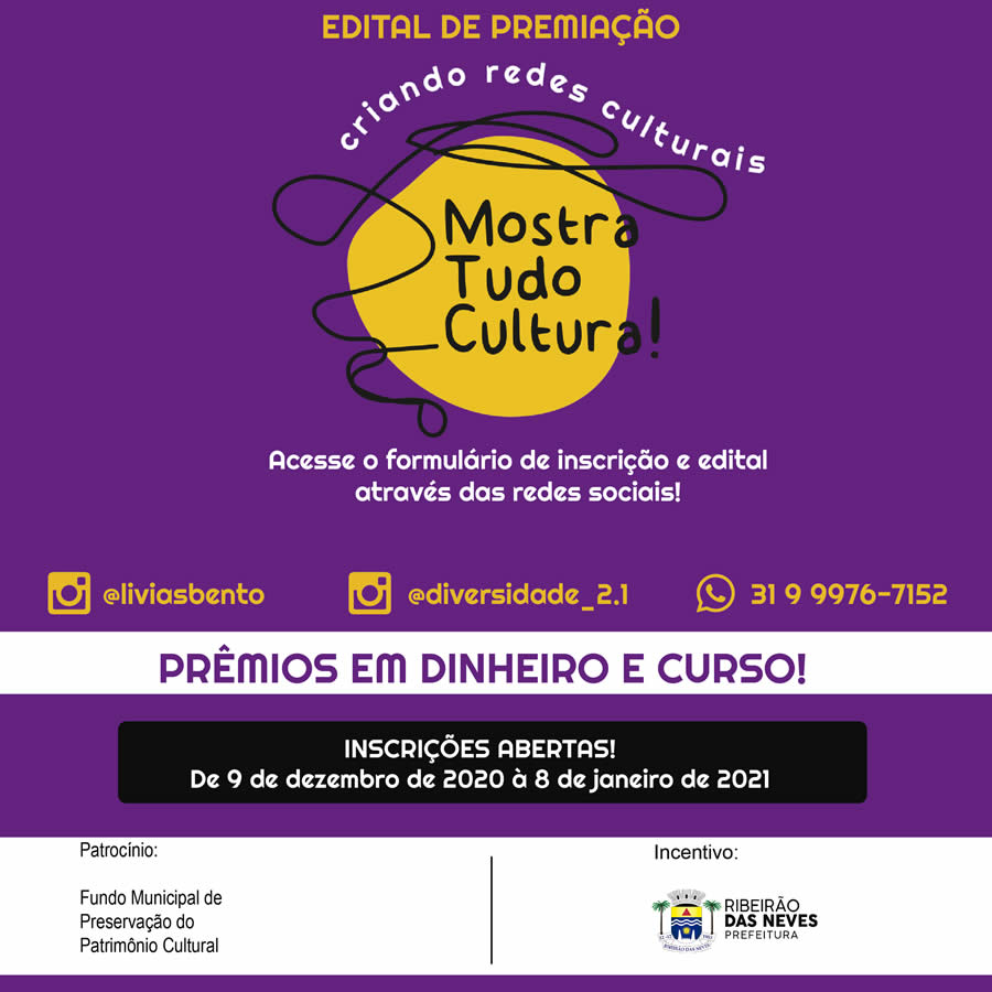 Estão abertas as inscrições para o prêmio "Mostra Tudo Cultura!", que tem como objetivo premiar iniciativas ligadas à área artística e cultural do município de Ribeirão das Neves. As inscrições podem ser realizadas até sexta-feira, dia 8 de janeiro.