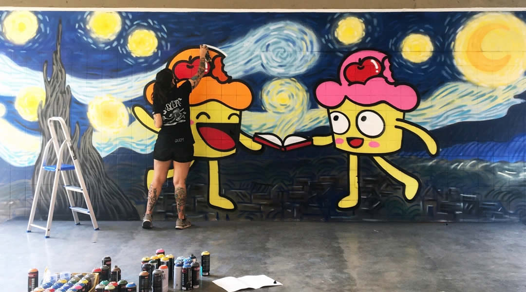 O painel elaborado proporcionou a escola uma intervenção artística importante, conectada com a arte urbana moderna que é o graffiti, em uma releitura na versão do Bolinho, de uma das obras mais importantes de Van Gogh, "A noite estrelada", de 1889.
