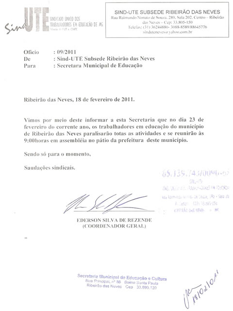 A Secretaria de Educação foi informada do movimento por meio de ofício (veja ao lado) protocolado pelo coordenador geral do sindicato no município, Ederson Silva de Rezende, na última sexta-feira (18).