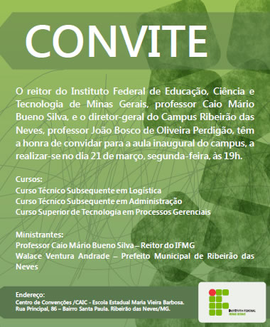 O reitor do Instituto Federal de Educação, Ciência e Tecnologia de Minas Gerais, professor Caio Mário Bueno Silva, e o diretor-geral do Campus Ribeirão das Neves, professor João Bosco de Oliveira Perdigão, convidam a população do município para a aula inaugural do campus, a realizar-se nesta segunda-feira, dia 21 de março, às 19h, no Centro de Convenções do CAIC, localizado na rua Principal, 86 – Bairro Santa Paula.