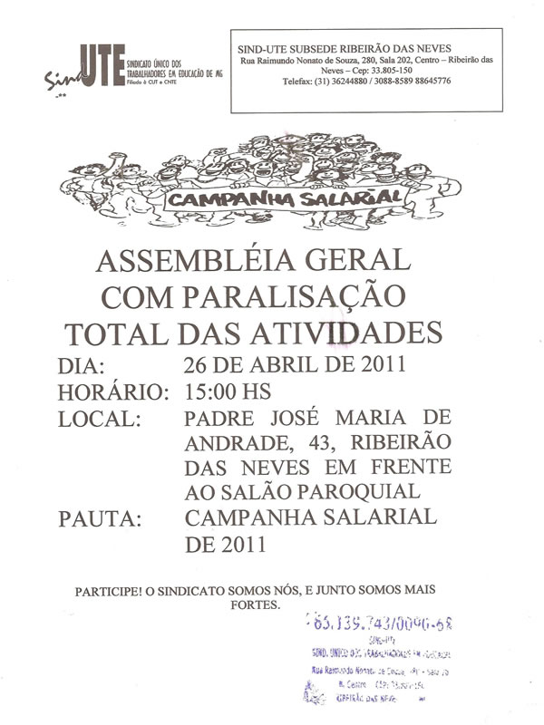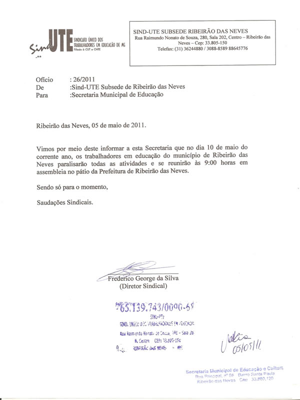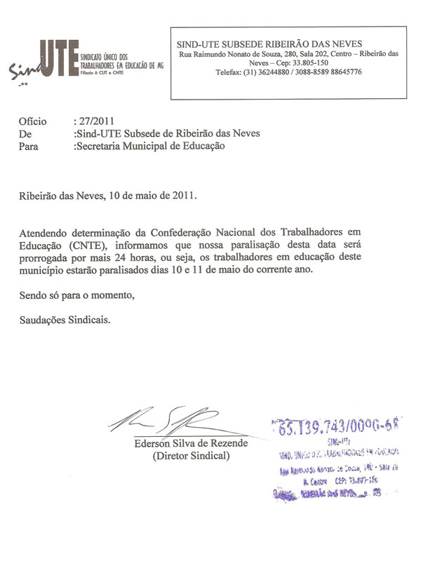 Atendendo determinação da Confederação Nacional dos Trabalhadores em Educação (CNTE), o Sind-UTE Ribeirão das Neves informou que a paralisação desta terça-feira (10) será prorrogada por mais 24 horas, ou seja, os trabalhadores em educação do município estarão paralisados nos dias 10 e 11 de maio.