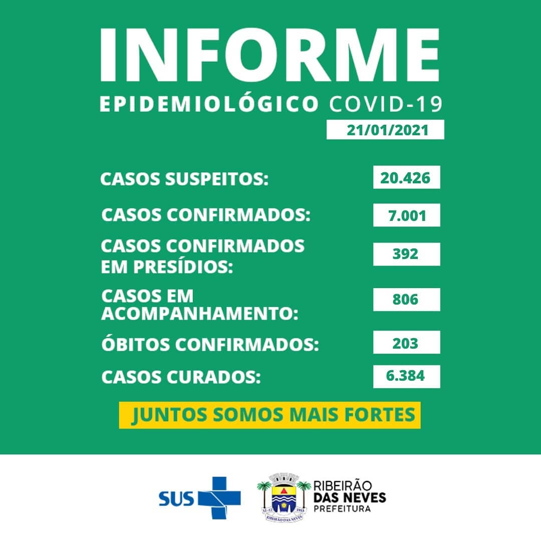 Até o momento, conforme Boletim Epidemiológico divulgado pela Secretaria Municipal de Saúde na última sexta-feira (22), Ribeirão das Neves já registrou 205 óbitos e 7.051 casos confirmados da doença, além de 20.494 casos suspeitos.