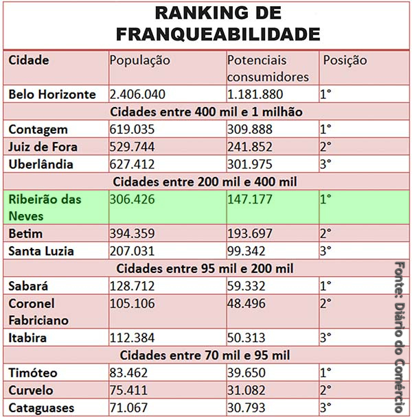 De acordo com o levantamento, Ribeirão das Neves possui maior potencial para receber negócios do segmento, entre as cidades analisadas com população entre 200 mil e 400 mil habitantes. O município, que já possui unidades das maiores redes de franquia do Brasil, como O Boticário, Subway, Cacau Show, CVC e Supermercado Dia%, ficou em primeiro lugar, analisando renda, população e potencial comprador.