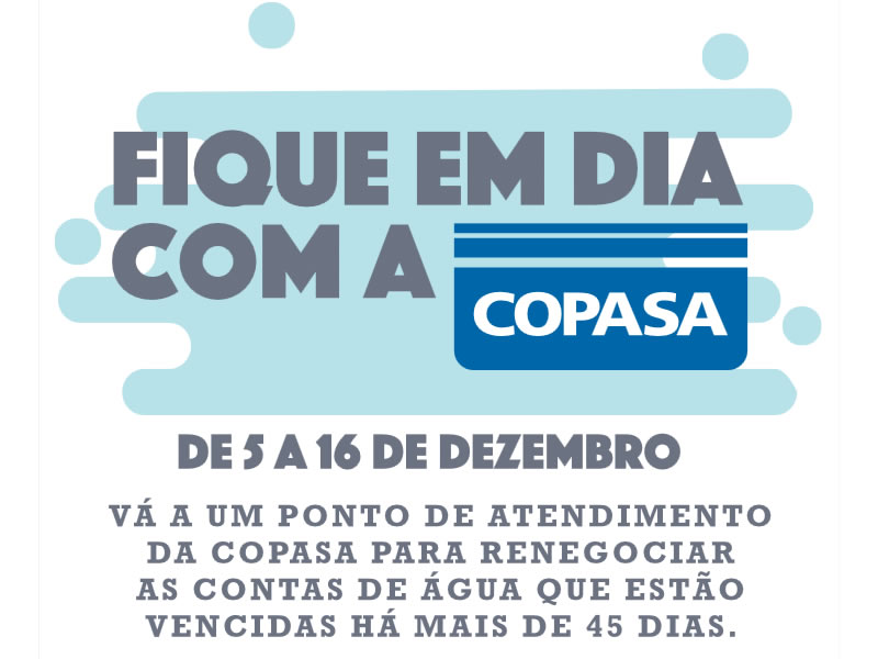 Com o objetivo de incentivar o pagamento das contas com mais de 45 dias em atraso, a Copasa fará o mutirão "Fique em Dia", entre 5 e 16 de dezembro, período em que serão realizadas negociações especiais com as pessoas físicas e as empresas que quiserem quitar ou parcelar seus débitos.