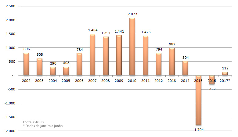 Os números foram ligeiramente melhores do que no mesmo período do ano passado, quando foram geradas 103 vagas nos primeiros seis meses de 2016.