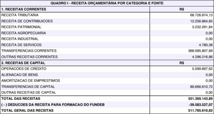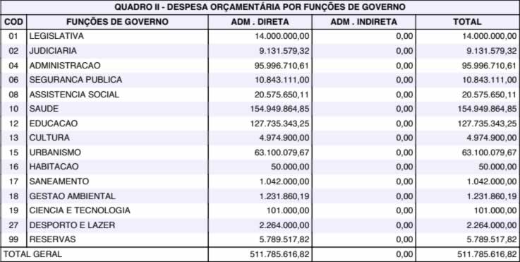 De acordo com o documento, as receitas serão levantadas com a arrecadação de tributos e outras receitas correntes e de capital. Já as despesas estão descriminadas em quadro anexo ao PL, cujos valores mais significativos serão empregados na saúde (R$ 154,9 mi), educação (R$ 127,7 mi) e administração (R$ 95,9 mi).