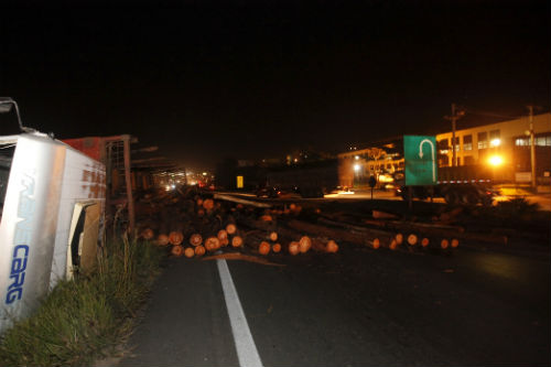 Segundo a assessoria da Polícia Rodoviária Federal (PRF), agentes atuaram na via para desviar o trânsito, que era feito apenas na via marginal desde às 17h45. A carga de madeira ficou espalhada pela pista.