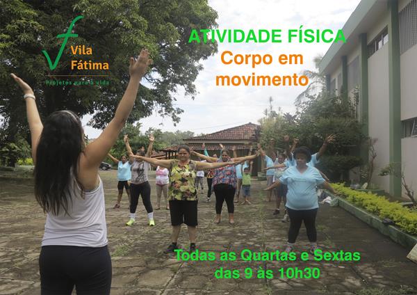 O projeto Vila Fátima está com inscrições abertas para a atividade física "Corpo em Movimento", que acontecem às quartas e sextas-feiras, de 9h às 10h30. Para participar, é necessário ter acima de 15 anos de idade e morar na região de Justinópolis, em Ribeirão das Neves.