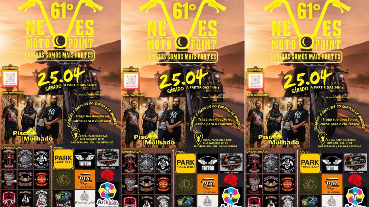 O ronco dos motores e o espírito de irmandade prometem movimentar a tarde deste sábado em Ribeirão das Neves. A cidade sedia a 61ª edição do Neves Moto Point, um dos encontros de motociclistas mais tradicionais da região. Sob o lema "Unidos Somos Mais Fortes", o evento acontece no Park Rock Bar, a partir das 14h.